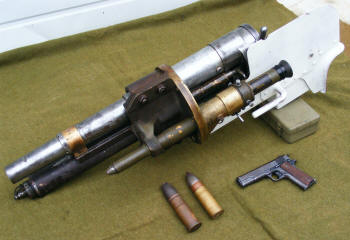 Located just beneath the barrel is the cylinder containing the recoil spring, and its glycerin lubricant. Between it and the barrel is the rail assembly with its attached traversing band around the middle section of the gun's barrel.