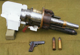 The WW1 M1911 .45 Auto is shown for size comparison. Along with original examples of the 37mm Solid Shot Shell, and Explosive Contact Shell.