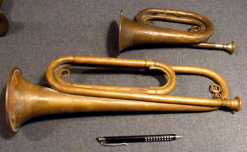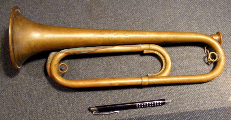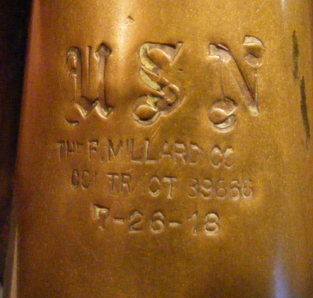 WW1 US Navy Landing Force Bugle. Measures overall length of 15 inches. Original chain to hold mouth piece. Marked with large letters "U.S.N." and maker's marking Millard Company Contract 39866 and dated of 7-26-18. These Bugles were issued to both US Navy Landing Forces and US Marine Corps. Rare. $325.00