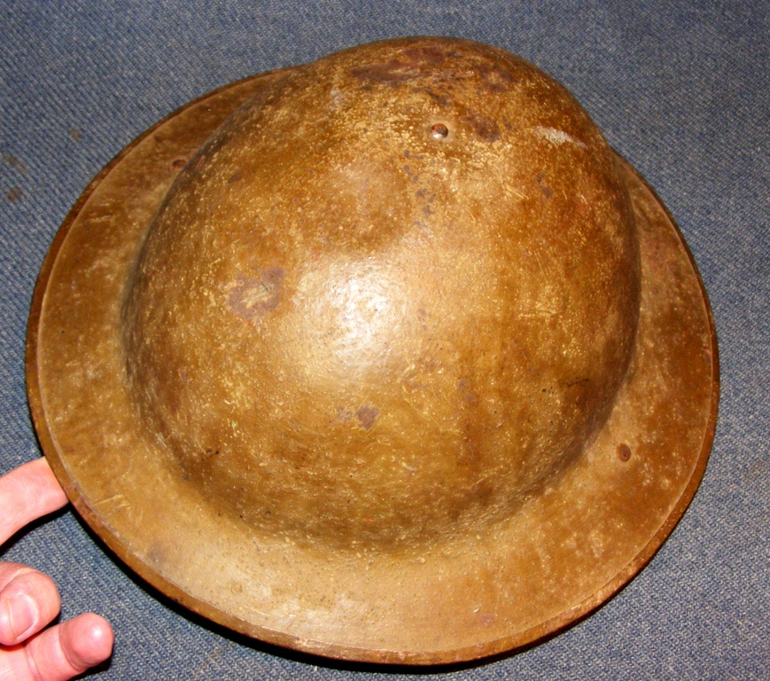 WW1 British Brodie Helmet with liner and chin strap. Issued to American Soldier with Initials JTS 1918 on inside of rim. Nice example. $175.00