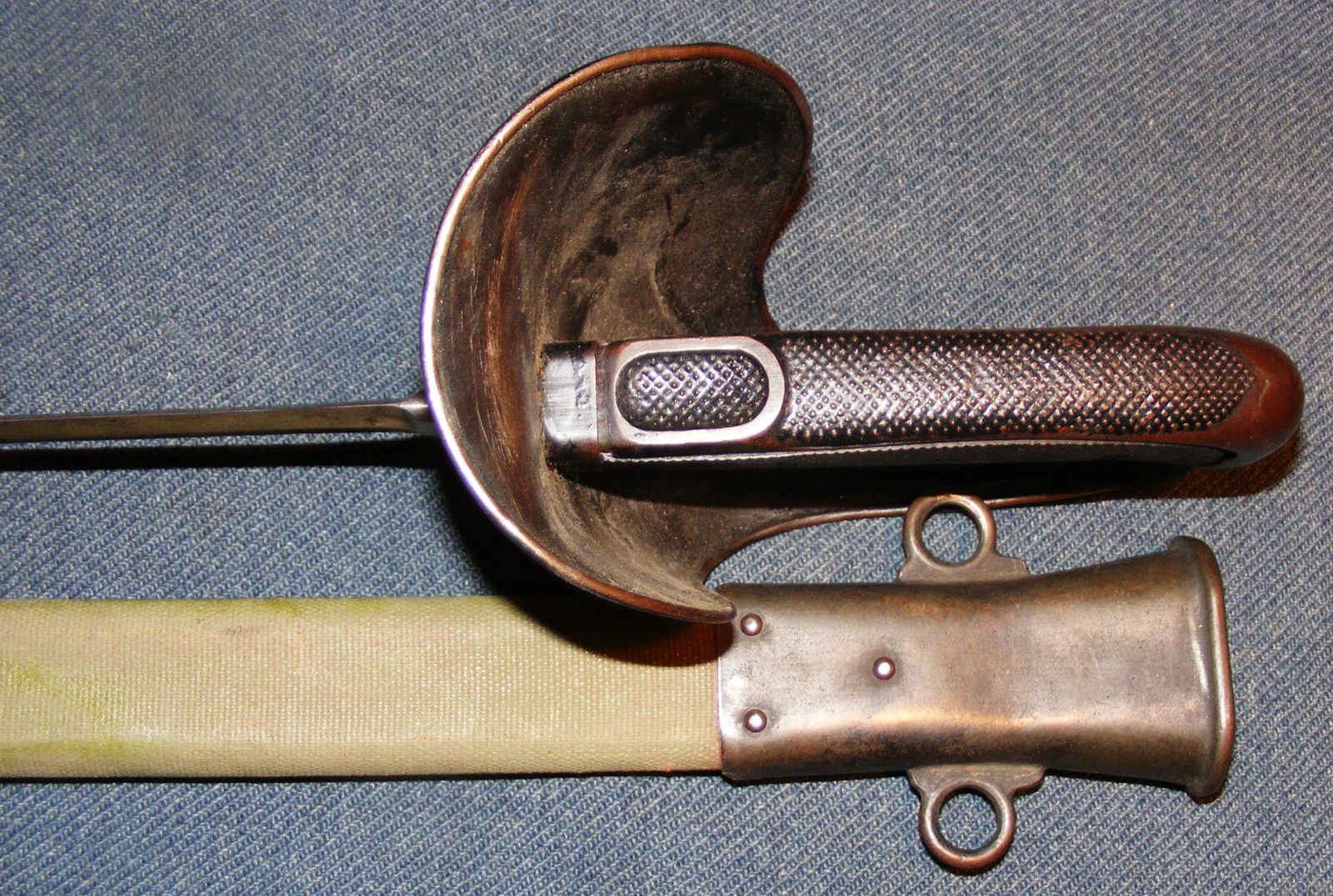 M1913 US Enlisted Patton Sword with web covered Scabbard. Ricasso of blade marked L.F& Co./ US/Ord Bomb and nice WW1 date of 1918. The last of the bright blades as issued to the US Cavalry. Only the elements of the 2nd, 3rd, 6th, 12th and 15th Cavalry served in the American Expeditionary Force in France during the Great War. Nice Sword set $650.00