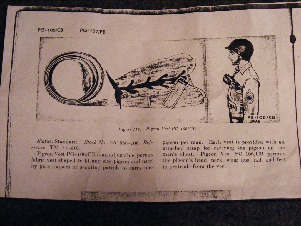 WW2 US Army Pigeon Vest PG-106-C/B. Original and Like new Condition. Widely issued to Paratroopers who were out of radio range (easily done during WW2). $125.00