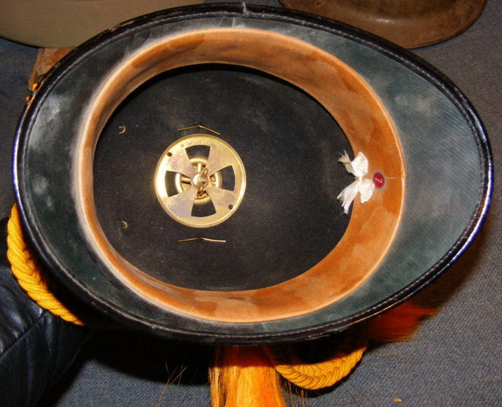 M1881 US Cavalry Dress helmet with Mounted Cavalry plate with No. 3 for the 3rd US Cavalry. Helmet is excellent with original yellow aiguillette Cords and the Triplett Cord on Helmet. Quarter markings on inside of sweatband. Felt Body is Excellent. Classic Indian War US Cavalry troopers Dress Helmet. $1895.00